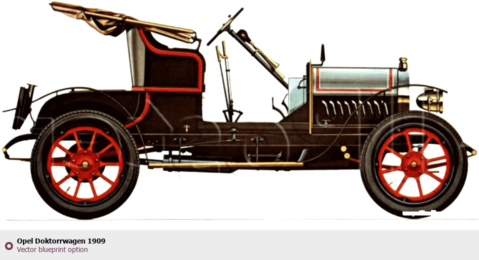Raster blueprint of the 1909 Opel Doktorrwagen Tag. This free downloadable image can be used for graphic projects, digital design, and 3D modeling. The file provides accurate exterior proportions of the vehicle. Model year: 1909. Body type: Tag.