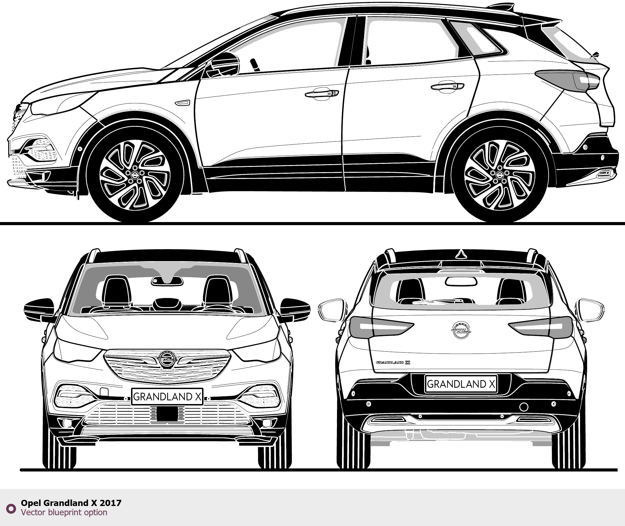 Raster blueprint of the 2017 Opel Grandland X SUV. This free downloadable image can be used for graphic projects, digital design, and 3D modeling. The file provides accurate exterior proportions of the vehicle. Model year: 2017. Body type: SUV.