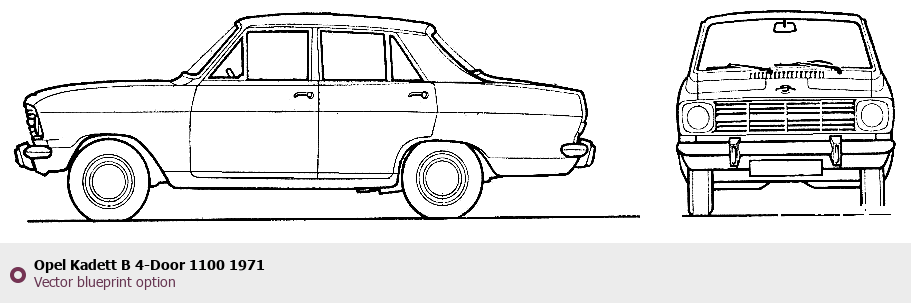 Raster blueprint of the 1971 Opel Kadett B 4-Door 1100 Tag. This free downloadable image can be used for graphic projects, digital design, and 3D modeling. The file provides accurate exterior proportions of the vehicle. Model year: 1971. Body type: Tag.