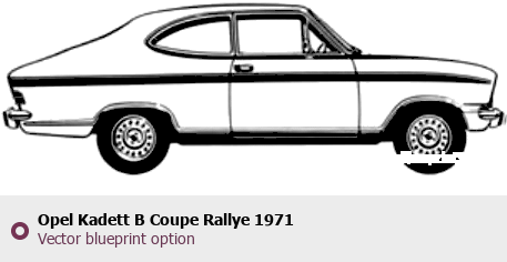 Raster blueprint of the 1971 Opel Kadett B Coupe Rallye Coupe. This free downloadable image can be used for graphic projects, digital design, and 3D modeling. The file provides accurate exterior proportions of the vehicle. Model year: 1971. Body type: Coupe.