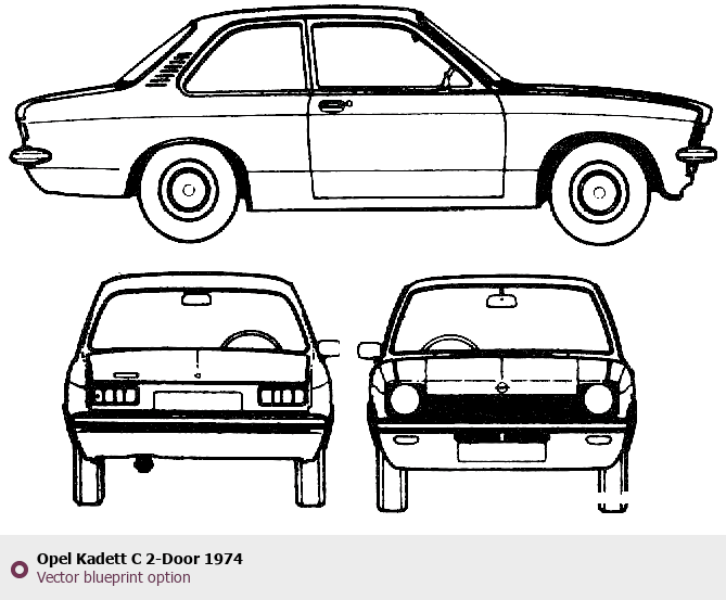 Raster blueprint of the 1974 Opel Kadett C 2-Door Tag. This free downloadable image can be used for graphic projects, digital design, and 3D modeling. The file provides accurate exterior proportions of the vehicle. Model year: 1974. Body type: Tag.