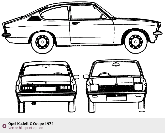 Raster blueprint of the 1974 Opel Kadett C Coupe Coupe. This free downloadable image can be used for graphic projects, digital design, and 3D modeling. The file provides accurate exterior proportions of the vehicle. Model year: 1974. Body type: Coupe.