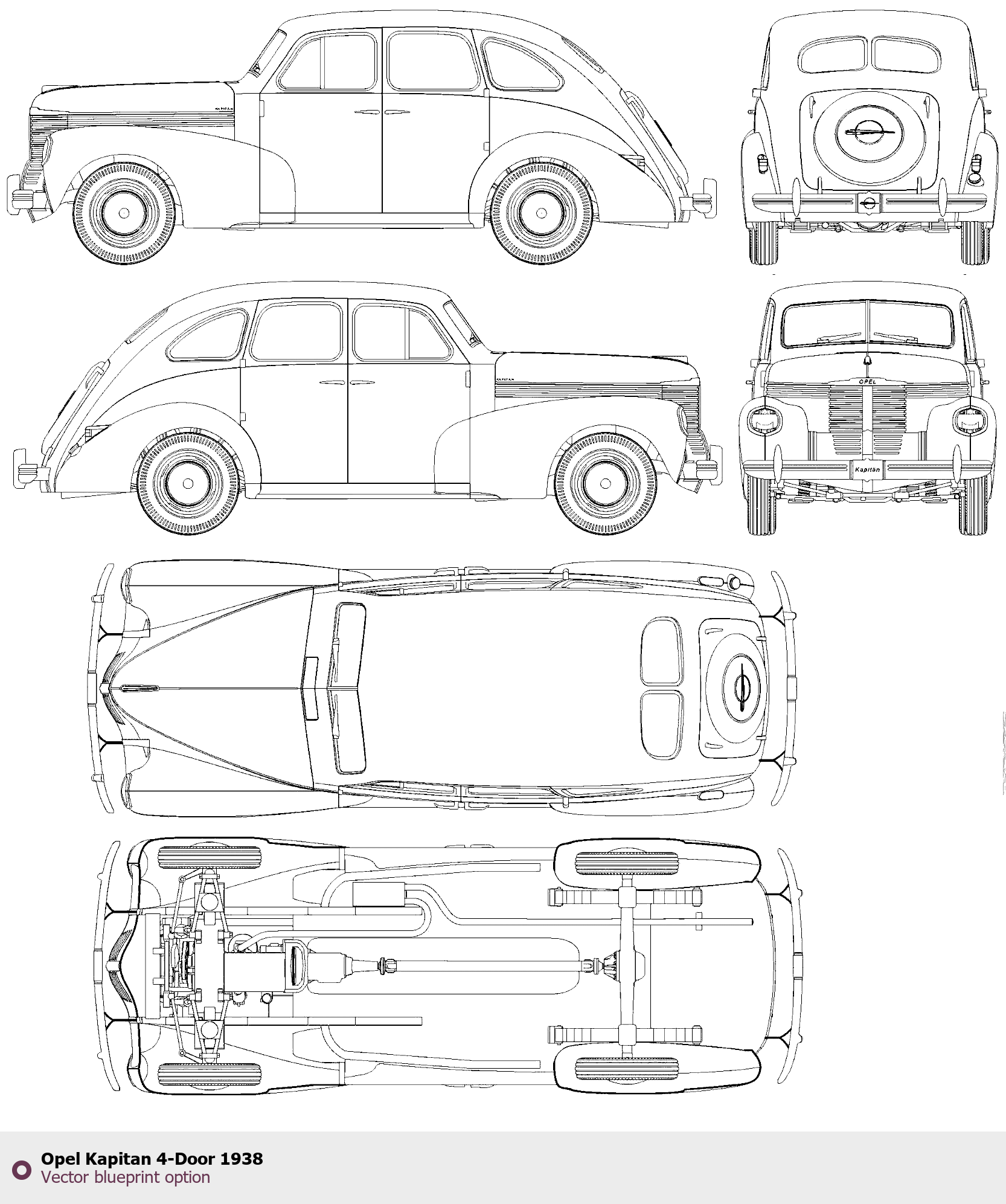 Raster blueprint of the 1938 Opel Kapitan 4-Door Tag. This free downloadable image can be used for graphic projects, digital design, and 3D modeling. The file provides accurate exterior proportions of the vehicle. Model year: 1938. Body type: Tag.