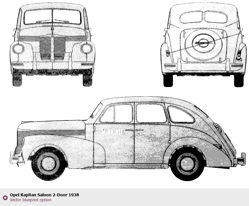 Raster blueprint of the 1938 Opel Kapitan Saloon 2-Door Sedan. This free downloadable image can be used for graphic projects, digital design, and 3D modeling. The file provides accurate exterior proportions of the vehicle. Model year: 1938. Body type: Sedan.