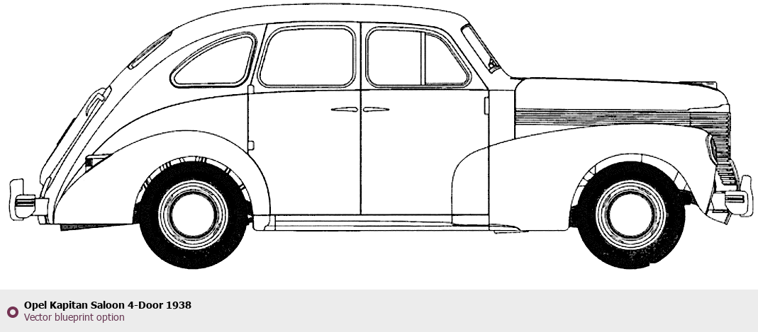 Raster blueprint of the 1938 Opel Kapitan Saloon 4-Door Sedan. This free downloadable image can be used for graphic projects, digital design, and 3D modeling. The file provides accurate exterior proportions of the vehicle. Model year: 1938. Body type: Sedan.