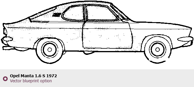 Raster blueprint of the 1972 Opel Manta 1.6 S Tag. This free downloadable image can be used for graphic projects, digital design, and 3D modeling. The file provides accurate exterior proportions of the vehicle. Model year: 1972. Body type: Tag.