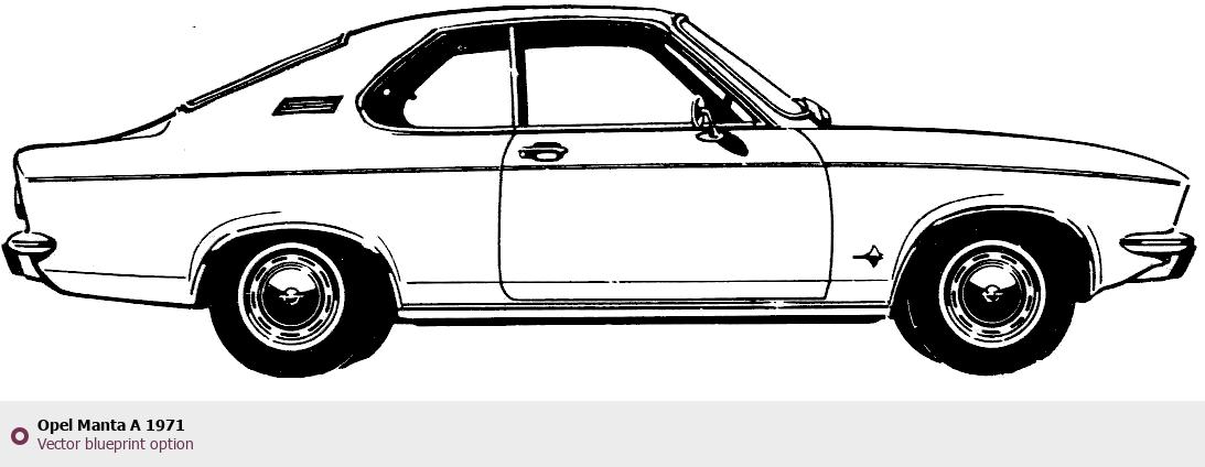 Raster blueprint of the 1971 Opel Manta A Tag. This free downloadable image can be used for graphic projects, digital design, and 3D modeling. The file provides accurate exterior proportions of the vehicle. Model year: 1971. Body type: Tag.