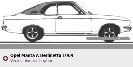 Raster blueprint of the 1969 Opel Manta A Berlinetta Tag. This free downloadable image can be used for graphic projects, digital design, and 3D modeling. The file provides accurate exterior proportions of the vehicle. Model year: 1969. Body type: Tag.