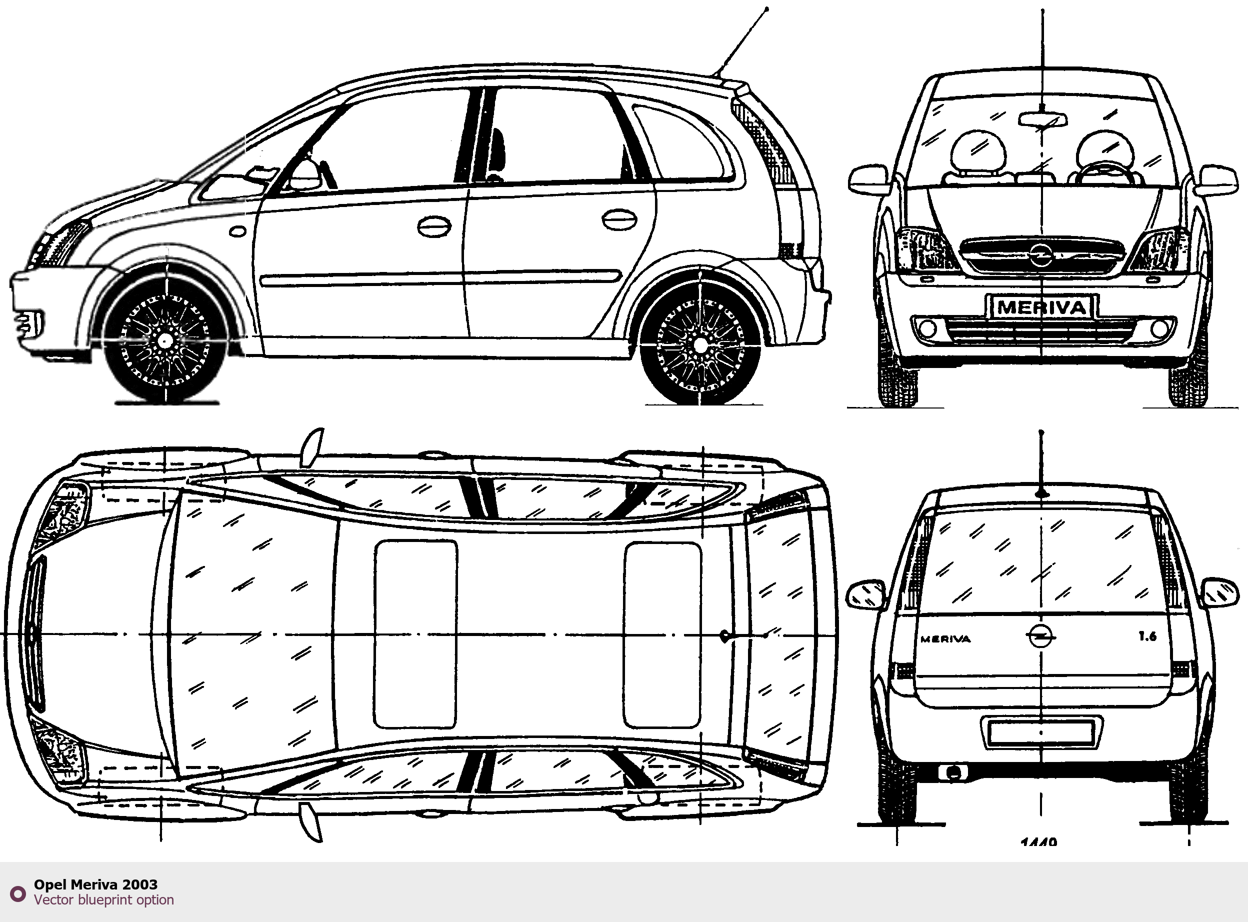 Raster blueprint of the 2003 Opel Meriva Minivan. This free downloadable image can be used for graphic projects, digital design, and 3D modeling. The file provides accurate exterior proportions of the vehicle. Model year: 2003. Body type: Minivan.