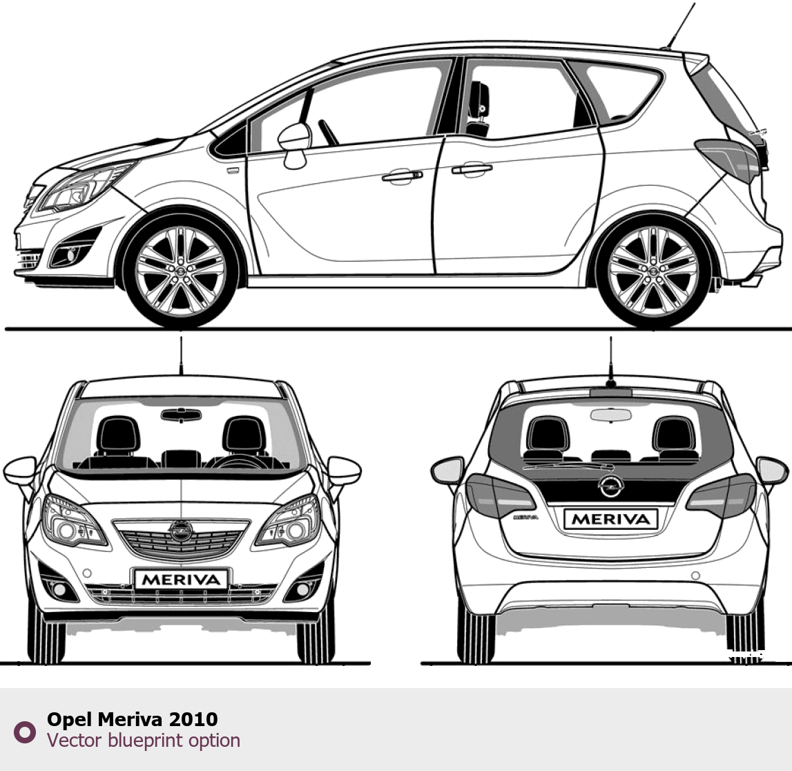 Raster blueprint of the 2010 Opel Meriva Minivan. This free downloadable image can be used for graphic projects, digital design, and 3D modeling. The file provides accurate exterior proportions of the vehicle. Model year: 2010. Body type: Minivan.