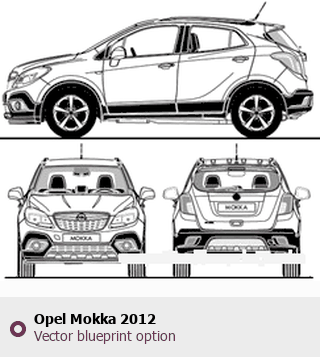 Raster blueprint of the 2012 Opel Mokka SUV. This free downloadable image can be used for graphic projects, digital design, and 3D modeling. The file provides accurate exterior proportions of the vehicle. Model year: 2012. Body type: SUV.