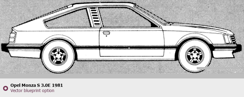 Raster blueprint of the 1981 Opel Monza S 3.0E Tag. This free downloadable image can be used for graphic projects, digital design, and 3D modeling. The file provides accurate exterior proportions of the vehicle. Model year: 1981. Body type: Tag.