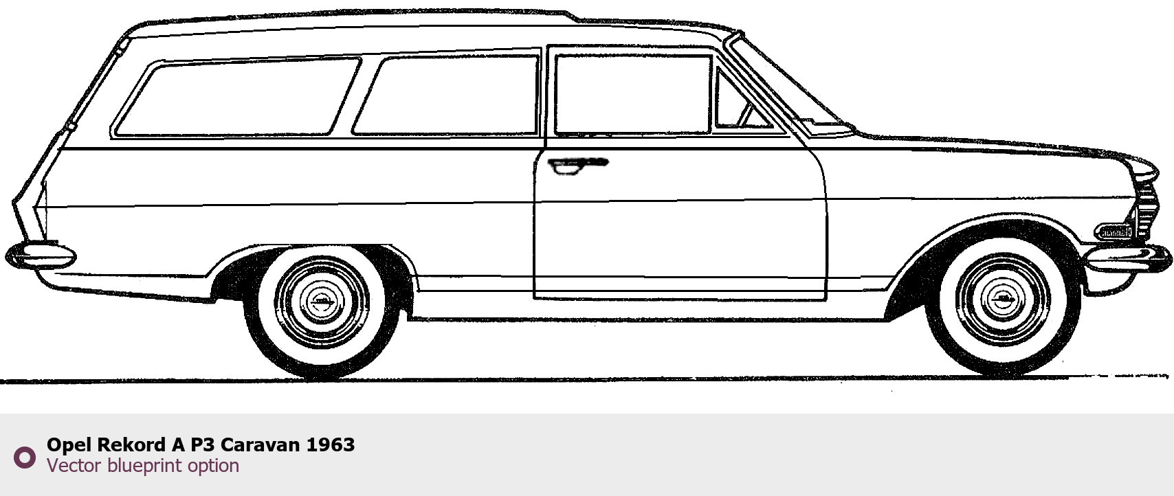 Raster blueprint of the 1963 Opel Rekord A P3 Caravan Wagon. This free downloadable image can be used for graphic projects, digital design, and 3D modeling. The file provides accurate exterior proportions of the vehicle. Model year: 1963. Body type: Wagon.