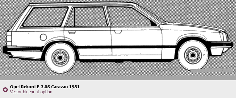 Raster blueprint of the 1981 Opel Rekord E 2.0S Caravan Wagon. This free downloadable image can be used for graphic projects, digital design, and 3D modeling. The file provides accurate exterior proportions of the vehicle. Model year: 1981. Body type: Wagon.