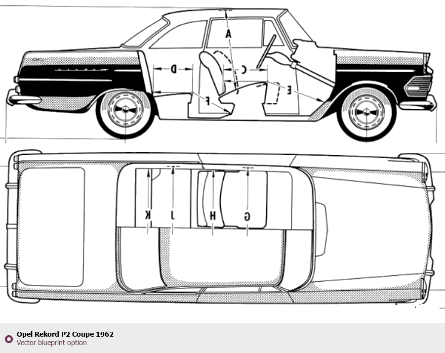 Raster blueprint of the 1962 Opel Rekord P2 Coupe Wagon. This free downloadable image can be used for graphic projects, digital design, and 3D modeling. The file provides accurate exterior proportions of the vehicle. Model year: 1962. Body type: Wagon.