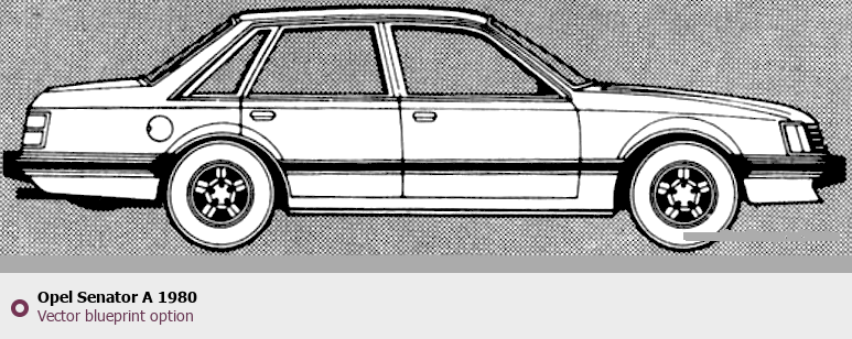 Raster blueprint of the 1980 Opel Senator A Tag. This free downloadable image can be used for graphic projects, digital design, and 3D modeling. The file provides accurate exterior proportions of the vehicle. Model year: 1980. Body type: Tag.
