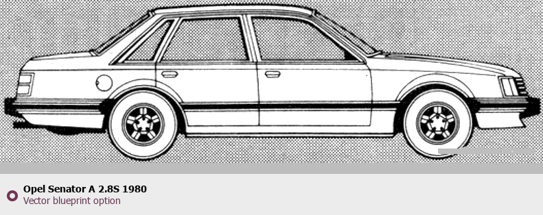 Raster blueprint of the 1980 Opel Senator A 2.8S Tag. This free downloadable image can be used for graphic projects, digital design, and 3D modeling. The file provides accurate exterior proportions of the vehicle. Model year: 1980. Body type: Tag.