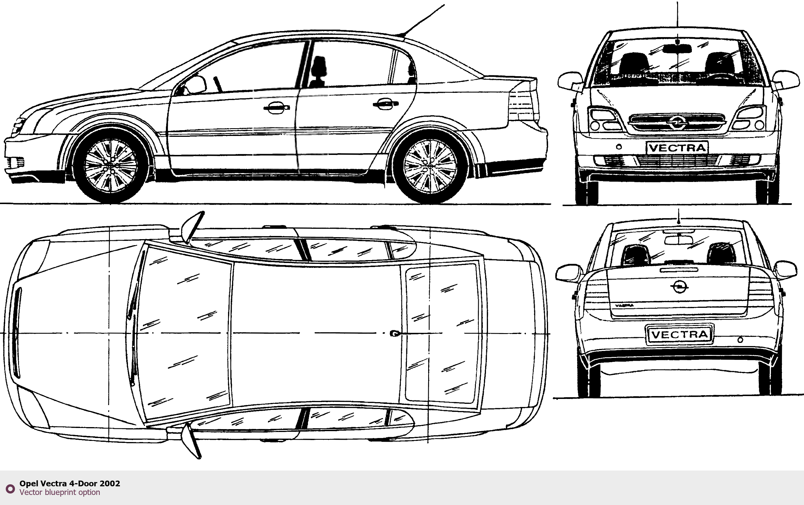Raster blueprint of the 2002 Opel Vectra 4-Door Tag. This free downloadable image can be used for graphic projects, digital design, and 3D modeling. The file provides accurate exterior proportions of the vehicle. Model year: 2002. Body type: Tag.