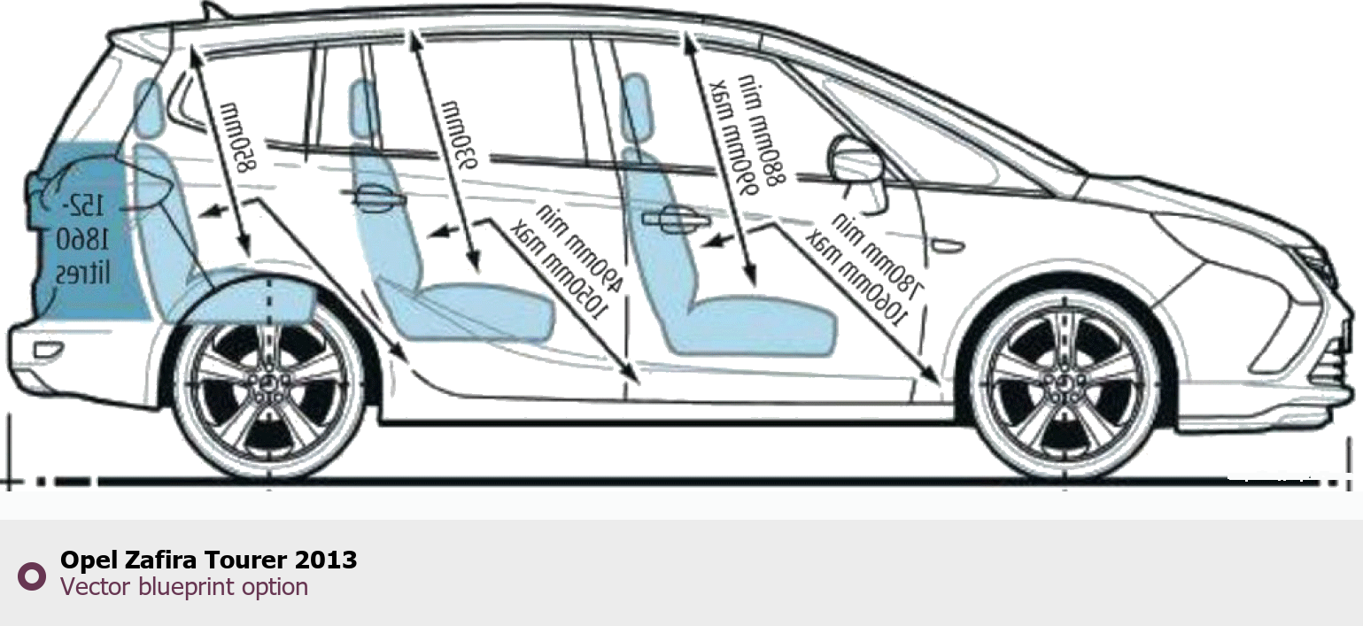 Raster blueprint of the 2013 Opel Zafira Tourer Minivan. This free downloadable image can be used for graphic projects, digital design, and 3D modeling. The file provides accurate exterior proportions of the vehicle. Model year: 2013. Body type: Minivan.