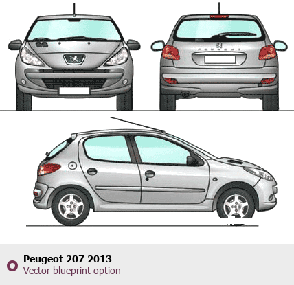 Raster blueprint of the 2013 Peugeot 207 Tag. This free downloadable image can be used for graphic projects, digital design, and 3D modeling. The file provides accurate exterior proportions of the vehicle. Model year: 2013. Body type: Tag.