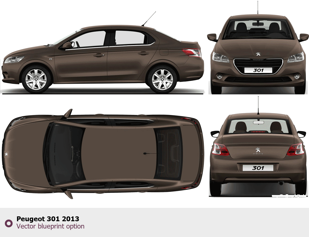 Raster blueprint of the 2013 Peugeot 301 Sedan. This free downloadable image can be used for graphic projects, digital design, and 3D modeling. The file provides accurate exterior proportions of the vehicle. Model year: 2013. Body type: Sedan.