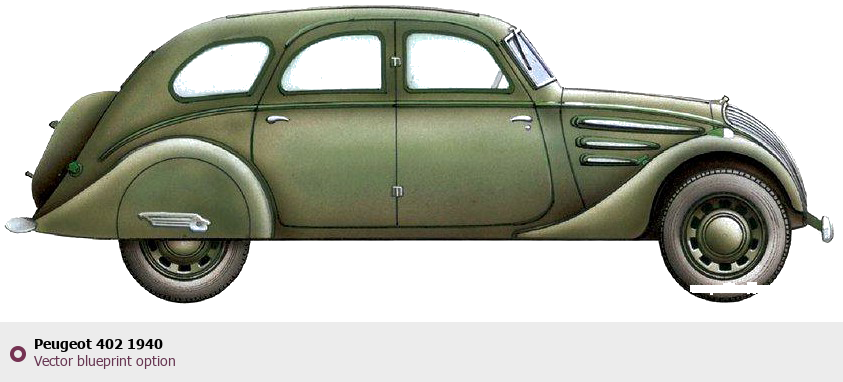 Raster blueprint of the 1940 Peugeot 402 Tag. This free downloadable image can be used for graphic projects, digital design, and 3D modeling. The file provides accurate exterior proportions of the vehicle. Model year: 1940. Body type: Tag.