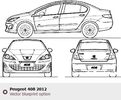 Raster blueprint of the 2012 Peugeot 408 Sedan. This free downloadable image can be used for graphic projects, digital design, and 3D modeling. The file provides accurate exterior proportions of the vehicle. Model year: 2012. Body type: Sedan.