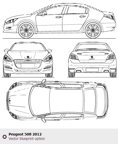 Raster blueprint of the 2012 Peugeot 508 Tag. This free downloadable image can be used for graphic projects, digital design, and 3D modeling. The file provides accurate exterior proportions of the vehicle. Model year: 2012. Body type: Tag.