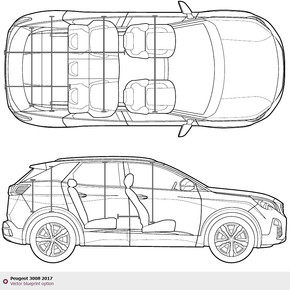 Raster blueprint of the 2017 Peugeot 3008 SUV. This free downloadable image can be used for graphic projects, digital design, and 3D modeling. The file provides accurate exterior proportions of the vehicle. Model year: 2017. Body type: SUV.