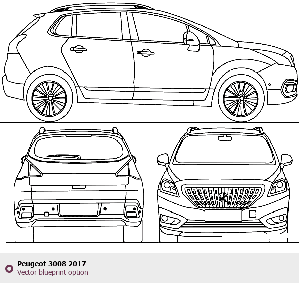 Raster blueprint of the 2017 Peugeot 3008 SUV. This free downloadable image can be used for graphic projects, digital design, and 3D modeling. The file provides accurate exterior proportions of the vehicle. Model year: 2017. Body type: SUV.