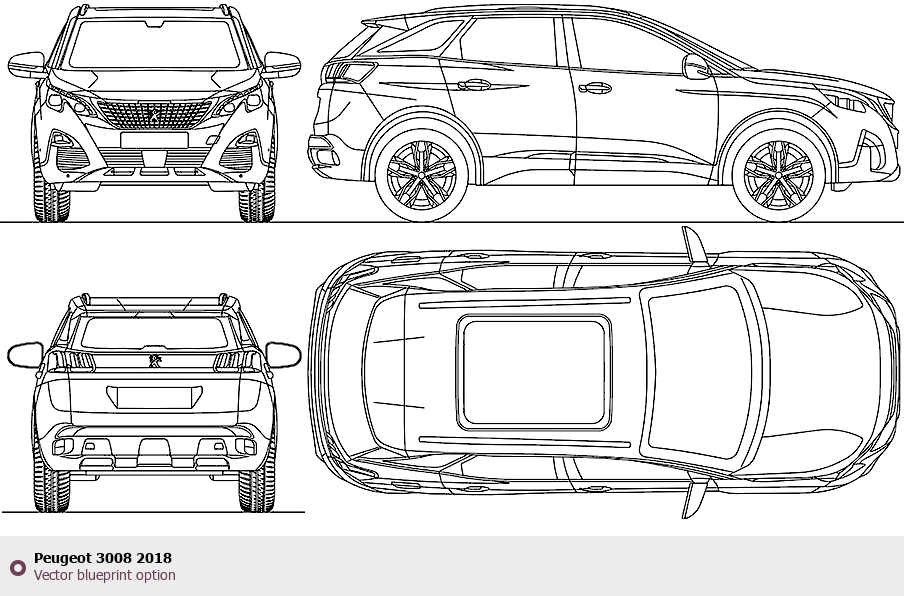 Raster blueprint of the 2018 Peugeot 3008 SUV. This free downloadable image can be used for graphic projects, digital design, and 3D modeling. The file provides accurate exterior proportions of the vehicle. Model year: 2018. Body type: SUV.