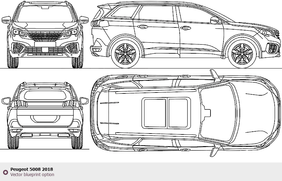 Raster blueprint of the 2018 Peugeot 5008 Tag. This free downloadable image can be used for graphic projects, digital design, and 3D modeling. The file provides accurate exterior proportions of the vehicle. Model year: 2018. Body type: Tag.