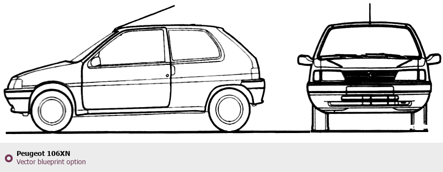 Raster blueprint of the Peugeot 106XN Hatchback. This free downloadable image can be used for graphic projects, digital design, and 3D modeling. The file provides accurate exterior proportions of the vehicle. Body type: Hatchback.