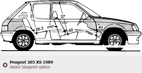 Raster blueprint of the 1989 Peugeot 205 XS Tag. This free downloadable image can be used for graphic projects, digital design, and 3D modeling. The file provides accurate exterior proportions of the vehicle. Model year: 1989. Body type: Tag.