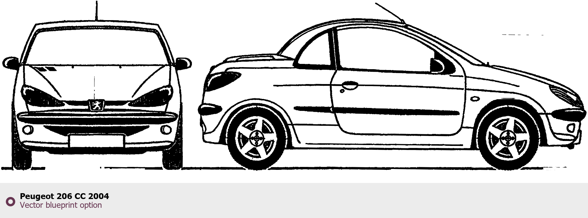Raster blueprint of the 2004 Peugeot 206 CC Tag. This free downloadable image can be used for graphic projects, digital design, and 3D modeling. The file provides accurate exterior proportions of the vehicle. Model year: 2004. Body type: Tag.