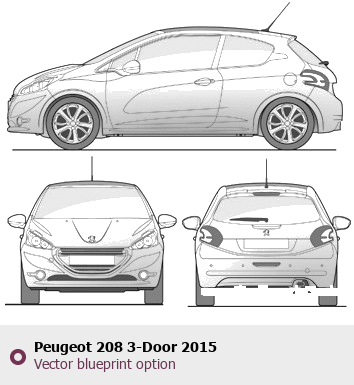 Raster blueprint of the 2015 Peugeot 208 3-Door Hatchback. This free downloadable image can be used for graphic projects, digital design, and 3D modeling. The file provides accurate exterior proportions of the vehicle. Model year: 2015. Body type: Hatchback.