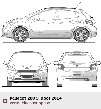 Raster blueprint of the 2014 Peugeot 208 5-Door Hatchback. This free downloadable image can be used for graphic projects, digital design, and 3D modeling. The file provides accurate exterior proportions of the vehicle. Model year: 2014. Body type: Hatchback.