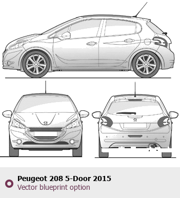 Raster blueprint of the 2015 Peugeot 208 5-Door Hatchback. This free downloadable image can be used for graphic projects, digital design, and 3D modeling. The file provides accurate exterior proportions of the vehicle. Model year: 2015. Body type: Hatchback.
