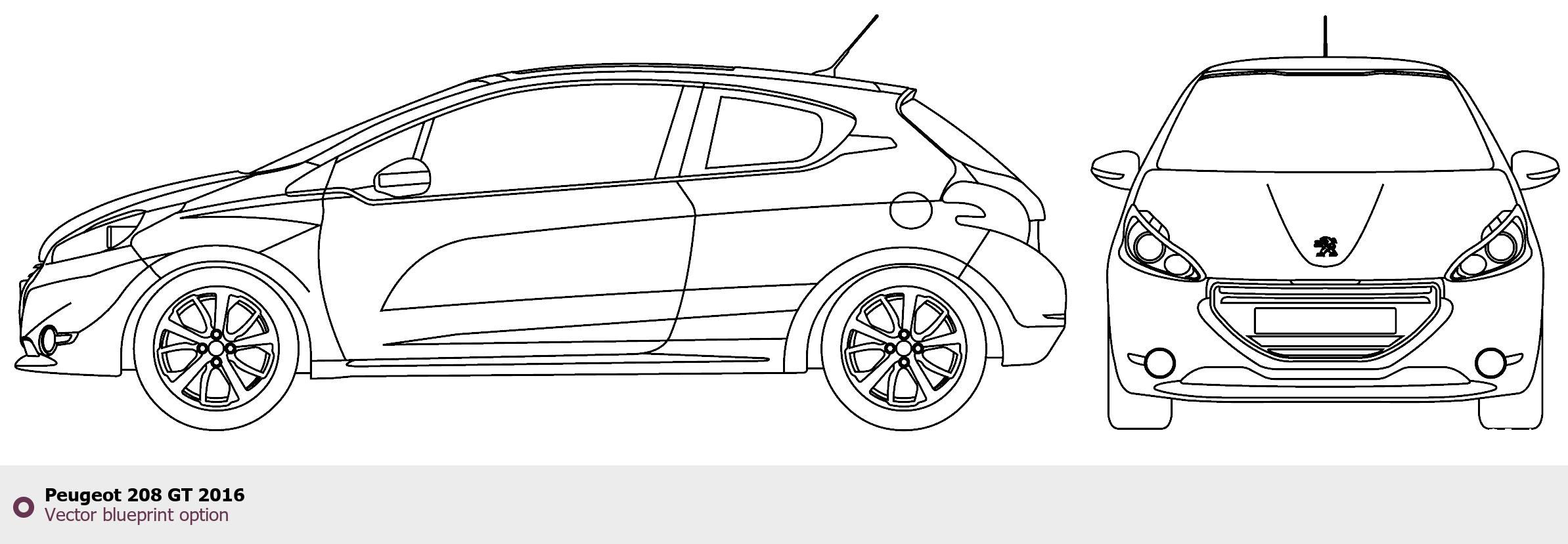 Raster blueprint of the 2016 Peugeot 208 GT Hatchback. This free downloadable image can be used for graphic projects, digital design, and 3D modeling. The file provides accurate exterior proportions of the vehicle. Model year: 2016. Body type: Hatchback.
