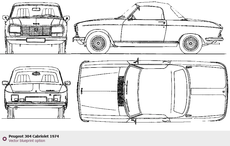 Raster blueprint of the 1974 Peugeot 304 Cabriolet Cabriolet. This free downloadable image can be used for graphic projects, digital design, and 3D modeling. The file provides accurate exterior proportions of the vehicle. Model year: 1974. Body type: Cabriolet.