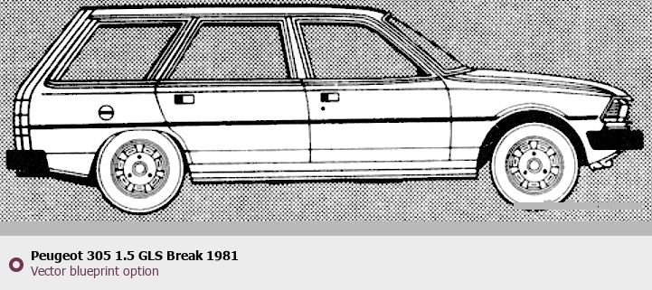 Raster blueprint of the 1981 Peugeot 305 1.5 GLS Break Wagon. This free downloadable image can be used for graphic projects, digital design, and 3D modeling. The file provides accurate exterior proportions of the vehicle. Model year: 1981. Body type: Wagon.