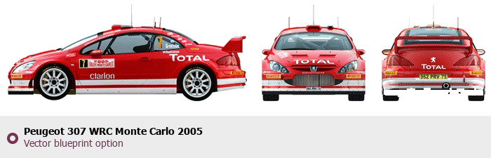 Raster blueprint of the 2005 Peugeot 307 WRC Monte Carlo Tag. This free downloadable image can be used for graphic projects, digital design, and 3D modeling. The file provides accurate exterior proportions of the vehicle. Model year: 2005. Body type: Tag.