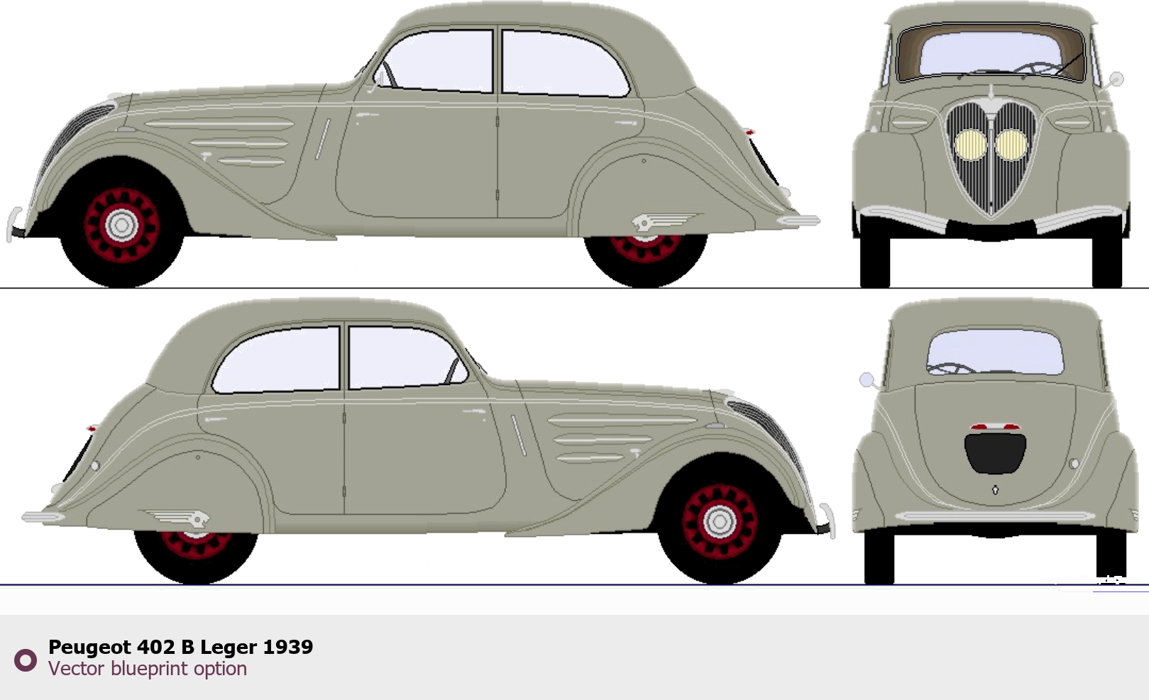 Raster blueprint of the 1939 Peugeot 402 B Leger Tag. This free downloadable image can be used for graphic projects, digital design, and 3D modeling. The file provides accurate exterior proportions of the vehicle. Model year: 1939. Body type: Tag.