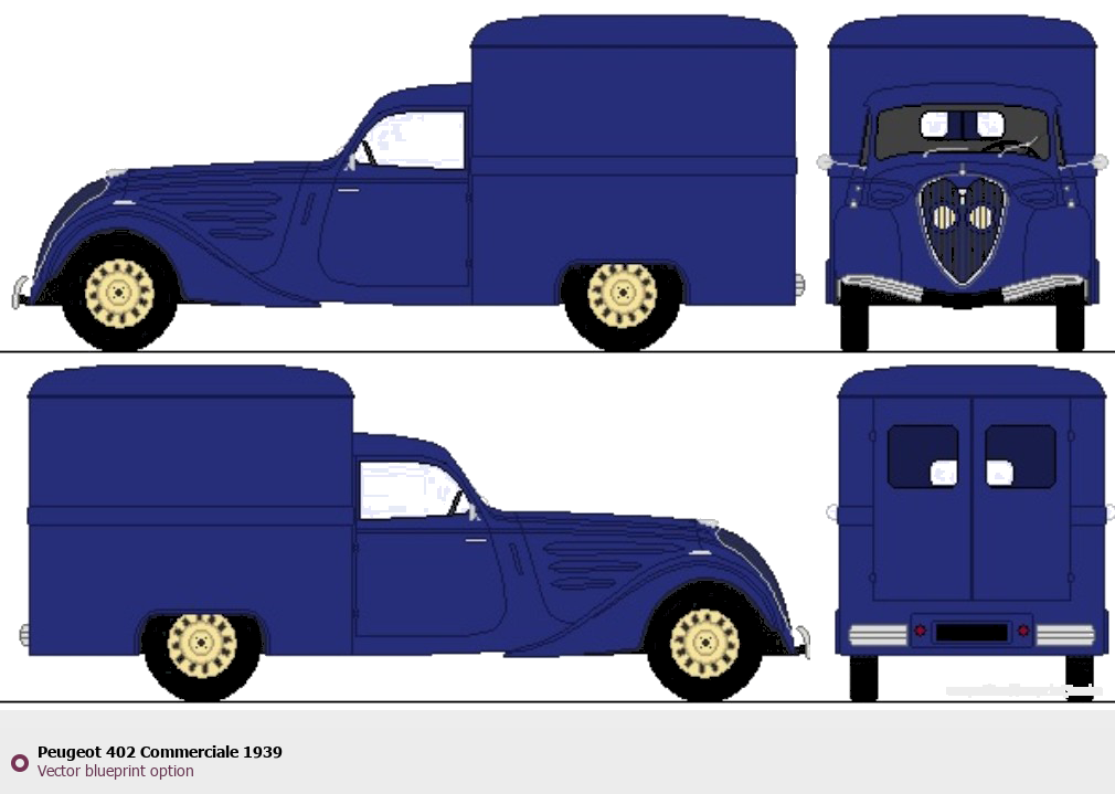 Raster blueprint of the 1939 Peugeot 402 Commerciale Tag. This free downloadable image can be used for graphic projects, digital design, and 3D modeling. The file provides accurate exterior proportions of the vehicle. Model year: 1939. Body type: Tag.