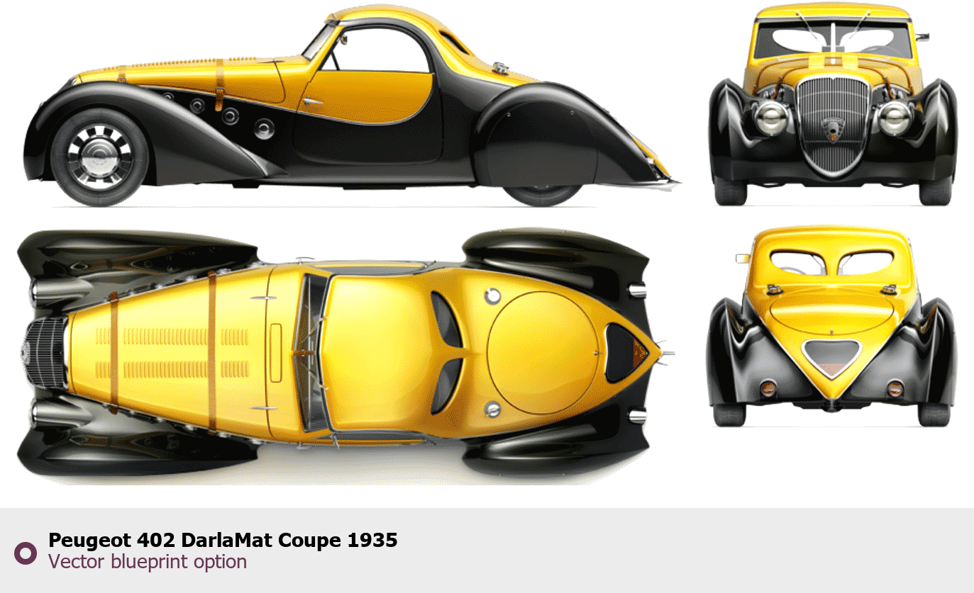 Raster blueprint of the 1935 Peugeot 402 DarlaMat Coupe Coupe. This free downloadable image can be used for graphic projects, digital design, and 3D modeling. The file provides accurate exterior proportions of the vehicle. Model year: 1935. Body type: Coupe.