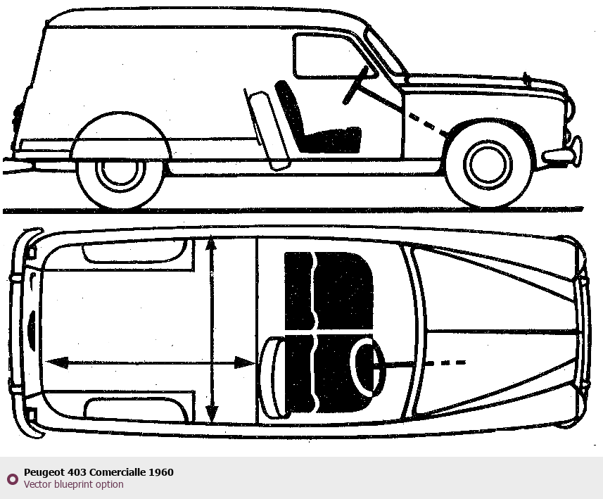 Raster blueprint of the 1960 Peugeot 403 Comercialle Tag. This free downloadable image can be used for graphic projects, digital design, and 3D modeling. The file provides accurate exterior proportions of the vehicle. Model year: 1960. Body type: Tag.