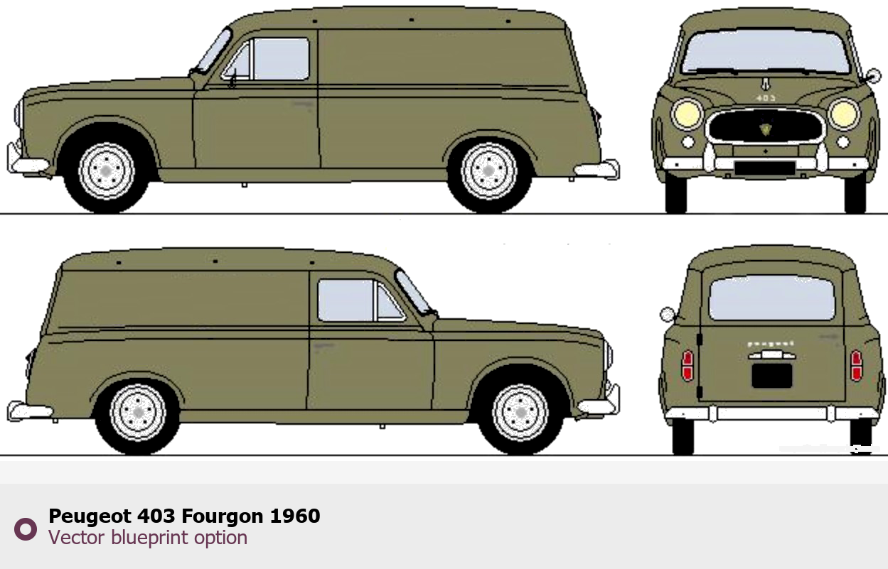 Raster blueprint of the 1960 Peugeot 403 Fourgon Tag. This free downloadable image can be used for graphic projects, digital design, and 3D modeling. The file provides accurate exterior proportions of the vehicle. Model year: 1960. Body type: Tag.