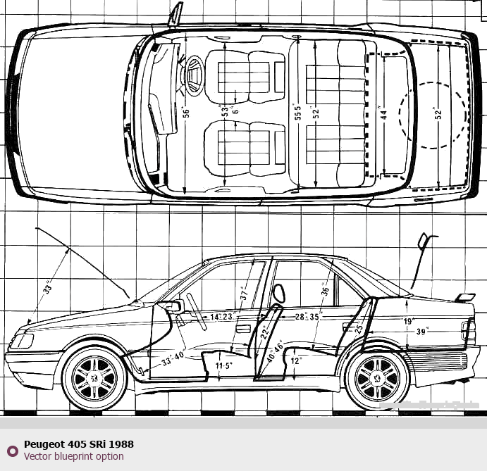 Raster blueprint of the 1988 Peugeot 405 SRi Tag. This free downloadable image can be used for graphic projects, digital design, and 3D modeling. The file provides accurate exterior proportions of the vehicle. Model year: 1988. Body type: Tag.