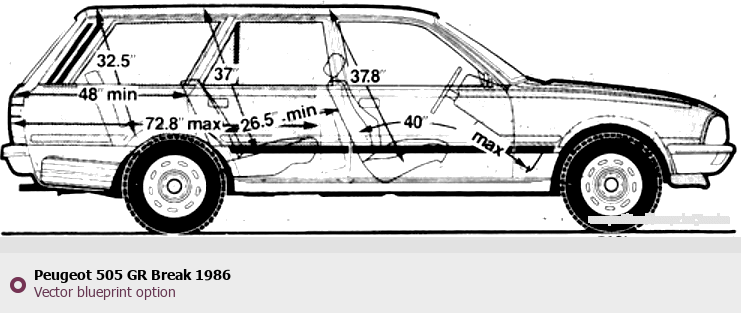 Raster blueprint of the 1986 Peugeot 505 GR Break Wagon. This free downloadable image can be used for graphic projects, digital design, and 3D modeling. The file provides accurate exterior proportions of the vehicle. Model year: 1986. Body type: Wagon.