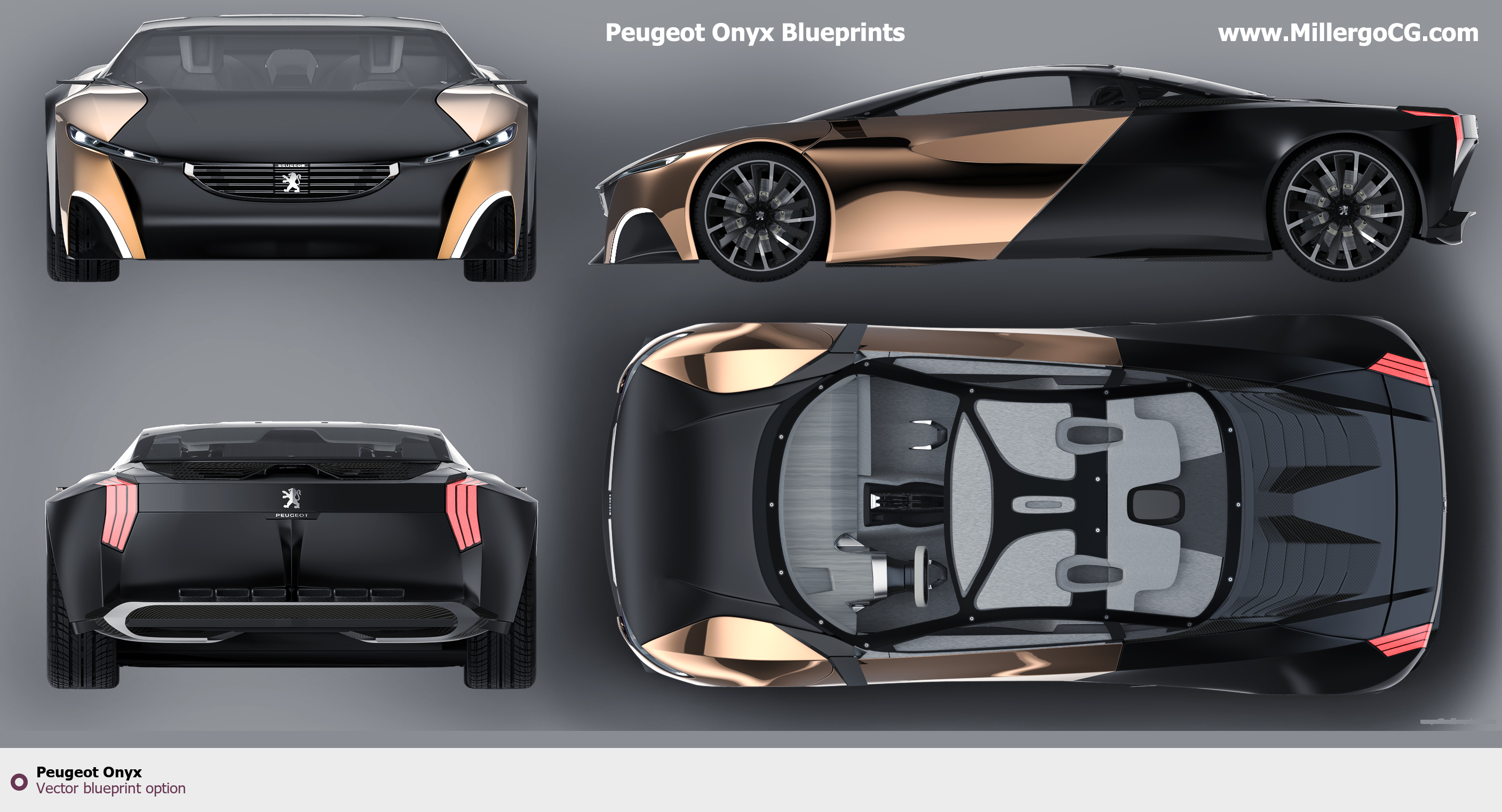 Raster blueprint of the Peugeot Onyx Tag. This free downloadable image can be used for graphic projects, digital design, and 3D modeling. The file provides accurate exterior proportions of the vehicle. Body type: Tag.